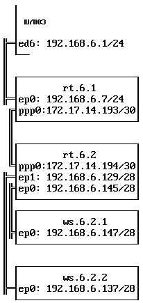 Подсеть на 16 машин выделена аналогично примеру 4. Я надеюсь, разбиение сети на подсети "круглого" размера, соединенные по ppp, после усвоение прочитанного окажется под силу любому.