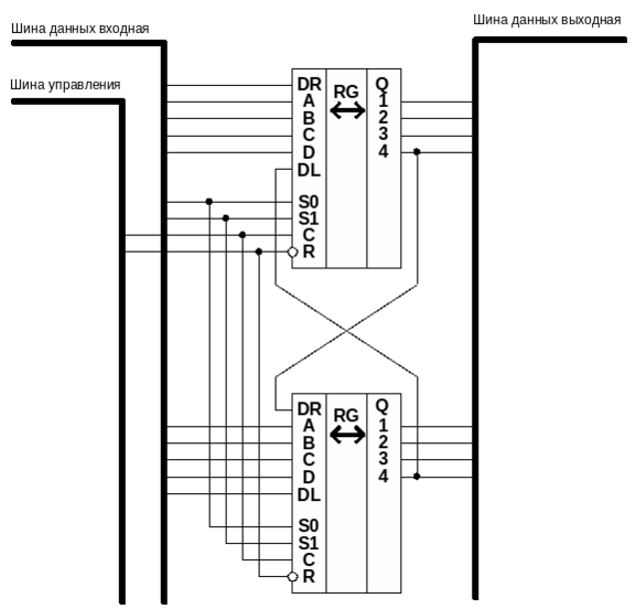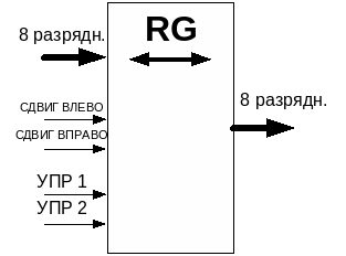 Ниже представлена функциональная схема универсально 8-ми разрядного регистра соединенного из двух 4х разрядных регистров ИР11.