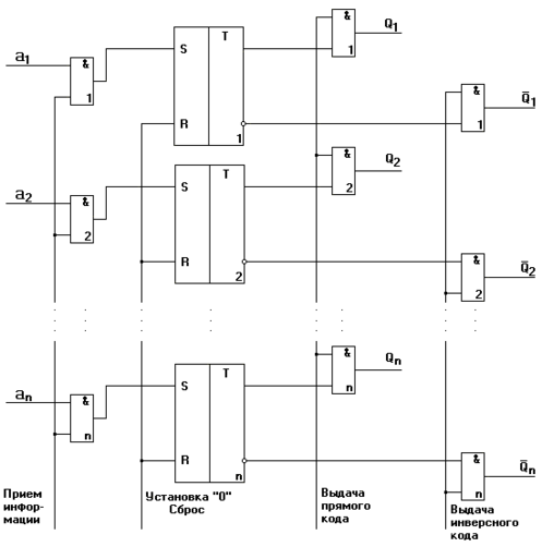Информация в регистрах данного типа заносится по линиям a1, a2,..., an только при подаче активного сигнала на вход "Прием информации". Записанный код числа будет храниться в регистре до тех пор, пока не будет сброса регистра или записи новой информации. Регистр позволяет выдавать данные в прямом коде, инверсном и парафазном коде.