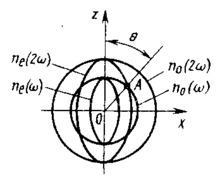 Условие волнового синхронизма можно выполнить в анизотропном кристалле, используя взаимодействие волн с разной поляризацией. Рассмотрим одноосный кристалл, в котором наблюдается двойное лучепреломление. В таком кристалле показатель преломления, а следовательно, фазовая скорость волны зависят