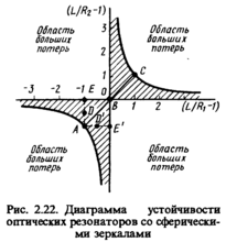 Точке C(1,1) соответствует резонатор, образованный двумя одинаковыми сферическими зеркалами, оси и центры кривизны которых совпадают (концентрический резонатор, лежащий на границе, разделяющей устойчивую и неустойчивую области). Такой резонатор применяют для селекции (отбора) неаксиальных колебаний.