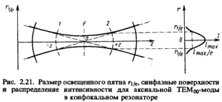 -мода конфокального резонатора представляет собой сферическую волну, распространяющуюся из его центра и обладающую гауссовым распределением интенсивности в плоскости, перпендикулярной направлению распространения. Основная часть энергии пучка сосредоточена в телесном угле: