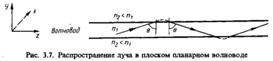 Распространение светового луча в таком волноводе схематически показано на рис. 3.7. Световая волна испытывает многократное полное внутреннее отражение и распространяется по зигзагообразному пути, поэтому ее иногда называют зигзагообразной волной. Для количественного описания электромагнитной волны необходимо решить уравнения Максвелла с соответствующими граничными условиями.
