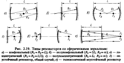 езонаторы с произвольными сферическими зеркалами. Эти резонаторы состоят из двух соосных сферических зеркал радиусами R1 и R2, расположенных на расстоянии L друг от друга.