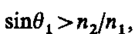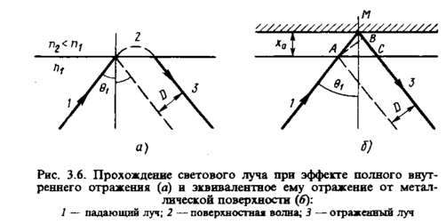 Эффект полного внутреннего отражения. Рассмотрение вопроса о прохождении электромагнитной волны через границу раздела показывает следующее. Если луч падает на поверхность раздела под углом, большим критического угла полного внутреннего отражения: