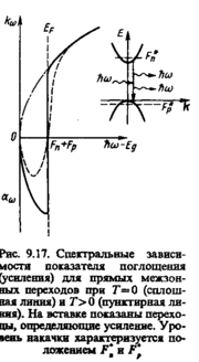 становится отрицательным. Этот диапазон энергий с отрицательным показателем поглощения как раз является спектральным диапазоном, в котором возможно усиление. Очевидно, что с ростом интенсивности накачки увеличивается расстояние между квазиуровнями Ферми, показатель усиления