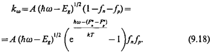 Соотношение (4.76) определяет условие инверсии населенностей в собственном полупроводнике для переходов зона—зона. Для того чтобы обеспечить преобладание усиления за счет процессов вынужденного испускания в полупроводнике над процессами собственного поглощения, необходимо создать такие избыточные неравновесные концентрации носителей заряда в зоне проводимости и в валентной зоне, при которых расстояние между квазиуровнями Ферми будет превышать ширину запрещенной зоны полупроводника. т. е. возбуждение должно быть настолько интенсивным, чтобы создать вырождение в зоне проводимости и в валентной зоне.