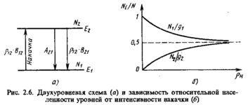 В такой системе возможны спонтанные и индуцированные оптические переходы, как показано на рис. 2.6, а. Будем осуществлять оптическую накачку на частоте перехода