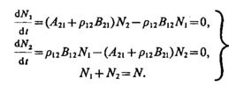 Чтобы определить, при каких условиях можно получить инверсию населенностей между конкретными энергетическими уровнями, следует знать кинетику заполнения энергетических состояний при наличии накачки. Для этого необходимо составить и решить соответствующие кинетические уравнения (уравнениями баланса).