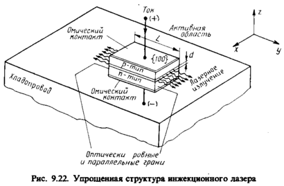 бщая схема инжекционного лазера приведена на рис. 9.22. При подаче смещения в прямом направлении электроны инжектируются в p-область, а дырки — в n-область, создавая вблизи p-n-перехода активный слой, в котором происходит излучательная рекомбинация. При большой плотности тока в вырожденном переходе в этом слое может быть реализовано условие инверсии. Плоскость p-n-перехода должна быть строго перпендикулярна сколотым граням резонатора, как показано на рис. 9.22. Для обеспечения эффективного взаимодействия света с активной средой необходимо совместить область, в которой создана инверсия, с областью распространения светового излучения, т. е. в одном и том же активном слое локализовать неравновесные носители заряда и фотоны.