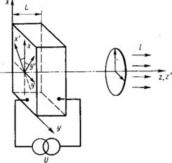Рис. 10.5. Схема элеггрооптического модулятора с поперечным полем. Для кристалла КДР обозначения осей x’y'z соответствуют рис. 10.2