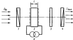 1 — входной поляризатор; 2 — электрооптический кристалл; 3 — четвертьволновая пластинка; 4 — выходной поляризатор (анализатор)