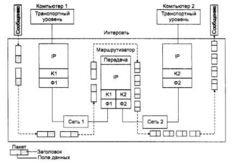 Пусть компьютер 1 связан с сетью, имеющей значение MTU в 4096 байт, например с сетью FDDI, При поступлении на IP-уровень компьютера 1 сообщения от транспортного уровня размером в 5600 байт протокол IP делит его на два IP-пакета, устанавливая в первом пакете признак фрагментации и присваивая пакету уникальный идентификатор, например 486, В первом пакете величина поля смещения равна 0, а во втором - 2800. Признак фрагментации во втором пакете равен нулю, что показывает, что это последний фрагмент пакета. Общая величина IP-пакета составляет 2800 плюс 20 (размер IP-заголовка), то есть 2820 байт, что умещается в поле данных кадра FDDI. Далее модуль IP компьютера 1 передает эти пакеты своему сетевому интерфейсу (образуемому протоколами канального уровня К 1 и физического уровня Ф1), Сетевой интерфейс отправляет кадры следующему маршрутизатору.