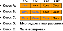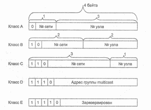 Если адрес начинается с последовательности 11110, то это значит, что данный адрес относится к классу Е. Адреса этого класса зарезервированы для будущих применений.