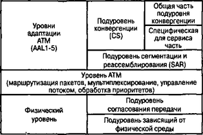 Уровень адаптации состоит из нескольких подуровней. Нижний подуровень AAL называется подуровнем сегментации и реассемблирования (Segmentation And Reassembly, SAR). Эта часть не зависит от типа протокола AAL (и, соответственно, от класса передаваемого трафика) и занимается разбиением (сегментацией) сообщения, принимаемого AAL от протокола верхнего уровня, на ячейки ATM, снабжением их соответствующим заголовком и передачей уровню ATM для отправки в сеть. Верхний подуровень AAL называется подуровнем конвергенции - Convergence Sublayer, CS. Этот подуровень зависит от класса передаваемого трафика. Протокол подуровня конвергенции решает такие задачи, как, например, обеспечение временной синхронизации между передающим и принимающим узлами (для трафика, требующего такой синхронизации), контролем и возможным восстановлением битовых ошибок в пользовательской информации, контролем целостности передаваемого пакета компьютерного протокола (Х.25, frame relay).