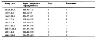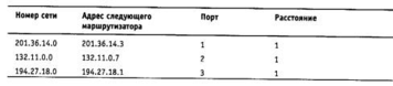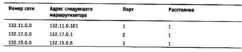 Записи с четвертой по девятую получены от соседних маршрутизаторов, и они претендуют на помещение в таблицу. Однако только записи с четвертой по седьмую попадают в таблицу, а записи восьмая и девятая - нет. Это происходит потому, что они содержат данные об уже имеющихся в таблице Ml сетях, а расстояние до них хуже, чем в существующих записях.