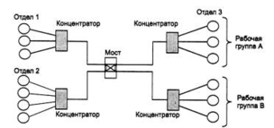 Для логической структуризации сети используются такие коммуникационные устройства, как мосты, коммутаторы, маршрутизаторы и шлюзы. Мост (bridge) делит разделяемую среду передачи сети на части (часто называемые логическими сегментами), передавая информацию из одного сегмента в другой только в том случае, если такая передача действительно необходима, то есть если адрес компьютера назначения принадлежит другой подсети. Тем самым мост изолирует трафик одной подсети от трафика другой, повышая общую производительность передачи данных в сети. Локализация трафика не только экономит пропускную способность, но и уменьшает возможность несанкционированного доступа к данным, так как кадры не выходят за пределы своего сегмента и их сложнее перехватить злоумышленнику.