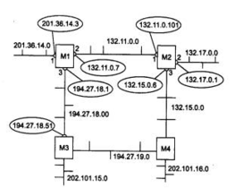 В этой сети имеется восемь IP-сетей, связанных четырьмя маршрутизаторами с идентификаторами: Ml, М2, МЗ и М4. Маршрутизаторы, работающие по протоколу RIP, могут иметь идентификаторы, однако для работы протокола они не являются необходимыми. В RIP-сообщениях эти идентификаторы не передаются.