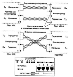Для соединения концентраторов технологии 10Base-T между собой в иерархическую систему коаксиальный или оптоволоконный кабель не обязателен, можно применять те же порты, что и для подключения конечных станций, с учетом одного обстоятельства. Дело в том, что обычный порт RJ-45, предназначенный для подключения сетевого адаптера и называемый MDI-X (кроссированный MDI), имеет инвертированную разводку контактов разъема, чтобы сетевой адаптер можно было подключить к концентратору с помощью стандартного соединительного кабеля, не кроссирующего контакты (рис. 4.6). В случае соединения концентраторов через стандартный порт MDI-X приходится использовать нестандартный кабель с перекрестным соединением пар. Поэтому некоторые изготовители снабжают концентратор выделенным портом MDI, в котором нет кроссирования пар. Таким образом, два концентратора можно соединить обычным некроссированным кабелем, если это делать через порт MDI-X одного концентратора и порт MDI второго. Чаще один порт концентратора может работать и как порт MDI-X, и как порт MDI, в зависимости от положения кнопочного переключателя, как это показано в нижней части рис. 4.6.