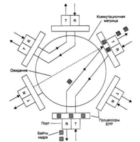 Коммутационная матрица работает по принципу коммутации каналов. Для 8 портов матрица может обеспечить 8 одновременных внутренних каналов при полудуплексном режиме работы портов и 16 - при полнодуплексном, когда передатчик и приемник каждого порта работают независимо друг от друга.