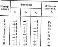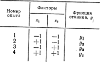 Чтобы построить поверхности отклика в виде плоскости, достаточно провести четыре опыта. Наиболее удобно выбранные факторы варьировать в максимальном или минимальном уровне, что соответствует Xi = +1 и Xi = —1. Для удобства планирования экспери