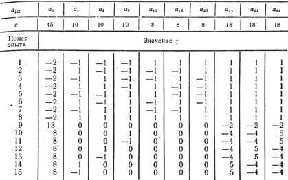 Такое планирование эксперимента, когда некоторые факторы приравнивают к произведению нескольких факторов, называется планированием со смешиванием. Его обозначают 2n~p, где л — число факторов; р — число факторов, приравниваемых к произведениям. Например, описанное выше планирование (табл. 4.18) обозначают 23-11