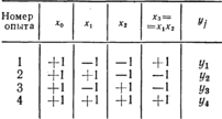 Общее число опытов т в матрице планирования полного факторного эксперимента равно т = 2n, (4.76) где n — число факторов. В случае линейного полинома для нахождения коэффициентоврегрессии можно уменьшить количество опытов, воспользовавшись методом дробных реплик, которые представляют собой часть матрицы полного факторного эксперимента (например, 1/2, 11/4 часть и т. д.). Так, чтобы найти коэффициенты регрессии уравнени