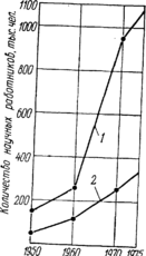 В настоящее время формируют систему своеобразных научных центров —научно-производственные объединения. Главной задачей их является ускорение научно-технического прогресса в отрасли, повышение эффективности научно-технических работ, сокращение, создание и внедрение в производство новых технологических процессов и новой продукции.К научным кадрам или научным работникам (HP) относят лиц, имеющих высшее образование и ведущих научно-исследовательскую или научно-педагогическую работу по утвержденному в установленном порядке плану. Научным работникам, успешно выполняющим в соответствии с установленными требованиями научную и педагогическую работу, присуждают ученые степени и ученые звания. Рост количества научных работников в СССР приведен на рис. 1.2.