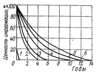 Информация имеет свойство «стареть». Это объясняется появлением новой печатной и неопубликованной информации или уменьшением потребности в данной информации. На рис. 2.1 приведены закономерности «старения» информации. По данным зарубежных исследований, интенсивность падения ценности информации («старения») ориентировочно составляет 10% в день для газет, 10% в месяц для журналов и 10% в год для книг.
