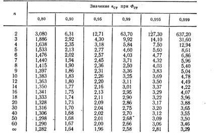 ) в зависимости от принятой доверительной вероятности Фcт и числа членов ряда n принимают коэффициент Студента