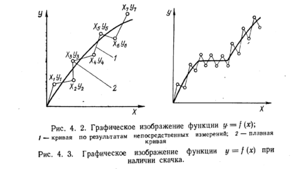 закономерности и форма графика экспериментатору ориентировочно известны из теоретических исследований. Точки на графике необходимо соединять плавной линией так, чтобы она по возможности ближе проходила ко всем экспериментальным точкам. Если соединить точки прямыми отрезками, то получим ломаную кривую. Она характеризует изменение функции по данным эксперимента. Обычно функции имеют плавный характер. Поэтому при графическом изображении результатов измерений следует проводить между точками плавные кривые. Резкое искривление графика объясняется погрешностями измерений. Если бы эксперимент повторили с применением средств измерений более высокой точности, то получили бы меньшие погрешности, а ломаная кривая больше бы соответствовала плавной кривой. Однако могут быть исключения. Так, иногда исследуются явления, для которых в определенных интервалах наблюдается быстрое скачкообразное изменение одной из координат (рис. 4.3). Это объясняется сущностью физико-химических процессов, например фазовыми превращениями влаги при исследовании промерзающих систем, радиоактивным распадом атомов в процессе исследования радиоактивности и т. д. В таких случаях необходимо особо тщательно соединять точки кривой. Общее «осреднение» всех точек плавной кривой может привести к тому, что скачок функции подменяется погрешностями измерений. Иногда при построении графика одна-две точки резко удаляются от кривой. Вначале нужно проанализировать физическую сущность явления, и если нет основания полагать наличие скачка функции. то такое резкое отклонение можно объяснить грубой ошибкой или промахом. Это может возникнуть тогда, когда данные измерений предварительно не исследовались на наличие грубых ошибок измерений. В таких случаях необходимо повторить измерение в диапазоне резкого отклонения точки. Если прежнее измерение оказалось ошибочным, то на график наносят новую точку. Если же повторные измерения дадут прежнее значение, необходимо к этому интервалу кривой отнестись очень внимательно и особо тщательно проанализировать физическую сущность явления. Часто при графическом изображении результатов экспериментов приходится иметь дело с тремя переменным b = f(x,y,z).В этом случае применяют метод разделения переменных. Одной из величин