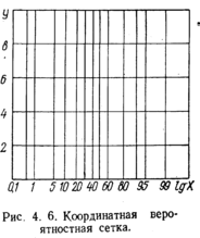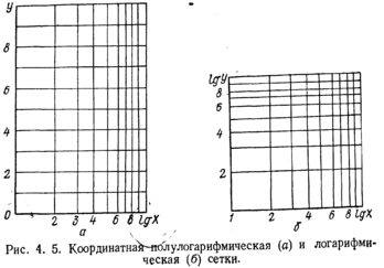 Полулогарифмическая сетка имеет равномерную ординату и логарифмическую абсциссу (рис. 4.5). Логарифмическая координатная сетка имеет обе оси логарифмические (см. рис. 4.5), вероятностная — ординату, обычно равномерную, и абсциссу — вероятностную