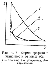 Масштаб по координатным осям обычно применяют различный От выбора его зависит форма графика — он может быть плоским (узким) или вытянутым (широким) вдоль оси (рис. 4.7). Узкие графики дают большую погрешность по оси гy, широкие — по оси х. Из рисунка видно, что правильно подобранный масштаб (нормальный график) позволяет существенно повысить точность отчетов. Расчетные графики, имеющие максимум (минимум) функции или какой-либо сложный вид, особо тщательно необходимо вычерчивать в зонах изгиба. На таких участках количество точек для вычерчивания графика должно быть значительно больше, чем на плавных участках. В некоторых случаях строят номограммы, существенно облегчающие применение для систематических расчетов сложных теоретических или эмпирических формул в определенных пределах измерения величин. Номограммированы могут быть любые алгебраические выражения. В результате сложные математические выражения можно решать сравнительно просто графическими методами. Построение номограмм — трудоемкая операция. Однако, будучи раз построенной, номограмма может быть использована для нахождения любого из переменных, входящих в номограммированное уравнение. Применение ЭВМ существенно снижает трудоемкость номограммирования. Существует несколько методов построения номограмм. Для этого применяют равномерные или неравномерные координатные сетки. В системе прямоугольных координат функции в большинстве случаев на номограммах имеют криволинейную форму. Это увеличивает трудоемкость, поскольку требуется большое количество точек для нанесения одной кривой. В полу- или логарифмических координатных сетках функции имеют прямолинейную форму и составление номограмм упрощается. Методика построения номограмм функции одной переменной у=f(лx) или многих у = f(x1 x2, ..., Хп) описана ранее и сводится к построению кривой, семейства или серии семейств путем принятия постоянных и нахождения одной переменной. Сложные алгебраические выражения целесообразно сводить к простому произведению двух-трех значений, например: d = = abc, где а, b, с — функции двух, трех переменных.В этом случае необходимо вначале, задавшись переменными, вычислить а, б, с. Далее, придавая а, Ь, с постоянные значения, найти а. Величины а, b, с необходимо варьировать в определенных значениях, например от 0 до 100 через 5 или 10. Наиболее эффективным является такой способ построения номограмм, при котором а, b, с представляются как безразмерные критерии (см. гл. 3).