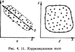 Суть корреляционно­го анализа сводится к установлению уравне­ния регрессии, т. е. вида кривой между случайны­ми величинами, оценке тесноты связей и достоверности результатов измерений. Чтобы предварительно определить наличие корреляционной свя­зи между х. и у, наносят точки на график и строят так называемое корреляционное поле (рис. 4.11). По тесноте группирования точек вокруг прямой или кривой линии, по наклону линии можно визуаль­но судить о наличии корреляционной связи. Так, из рис. 4.11, а видно, что экспериментальные данные имеют определенную связь между х и у. В то же время измерения, приведенные на рис. 4.11, б, такой связи не имеют. Корреляционное поле характеризует вид связи между х и у. По форме поля можно ориентировочно судить о форме графика, ха­рактеризующей прямолинейную или криволинейную зависимости. Даже для вполне выраженной формы корреляционного поля вслед­ствие статистического характера связи исследуемого явления одно значение х может иметь несколько значений у. Поэтому оптимальной будет такая функция, в которой соблюда­ются условия наименьших квадратов:
