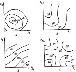 Рис. 4. 12. Виды поверхностей откликов: а — парабол-лоида; б — стационарной возвышенности; в — «хребет»;
