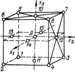 Аналогично составляют полином, план и матрицу планированиядля проведения 3-х, 4-х и большего количества факторов. План трехфакторного эксперимента представлен на рис. 4.14, матрица—в