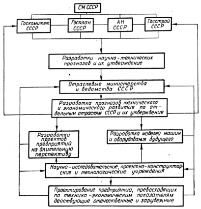 создания научно-технического задела. Отраслевые министерства, учитывая предложения научных учреждений и указания вышестоящих организаций, детально разрабатывают научно-технический прогноз развития отрасли. В соответствии с этим научно-исследовательские, проектно-конструкторские и технологические учреждения, вузы планируют свои НИР и ОКР.