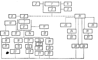 СССР; 8 — Государственный комитет по науке и технике; 9 — Постоянные комиссии палат по науке и культуре; 10 — Академия наук СССР; 11 — Госплан СССР; 12 — академии наук союзных республик, научно-исследовательские институты Академии наук СССР; 13 — институты информации; 14 — Комитет по делам открытий и изобретений; 15 — Научно-исследовательский экономический институт; 16— Минвуз; 17 — вузы и НИИ; 18—Министерство просвещения; 19 — вузы; 20 — Академия педагогических наук; 21—Министерство здравоохранения; 22—медицинские вузы; 23 — Академия медицинских наук; 24 — Министерство сельского хозяйства; 25 — отраслевые НИИ, опытные сельскохозяйственные станции; 26 — вузы; 27 — ВАСХНИЛ; 28 — отраслевые министерства; 29 — отраслевые НИИ, КБ и другие научные учреждения; 30 — НИИ при заводах, КБ, заводские лаборатории; 31 — органы научной общественности (при ВЦСПС, ЦК ВЛКСМ и других негосударственных организациях; 32 — научные общества, ученые советы, университеты, институты, лаборатории, кафедры, работающие на общественных началах; 33—Всесоюзное общество изобретателей и рационализаторов; 34 — Всесоюзное общество «Знание»; 35 — региональные отделения общества; 36 — Всесоюзный