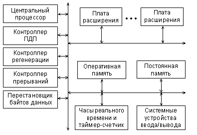 Контроллер прямого доступа к памяти принимает запрос на ПДП из системной магистрали, передает его процессору, а после предоставления процессором магистрали производит пересылку данных между памятью и устройством ввода/вывода. Все режимы функционирования контроллера ПДП задаются программно процессором перед началом работы. Использование встроенных в компьютер контроллеров прерываний и ПДП позволяет существенно упростить аппаратуру применяемых плат расширения.