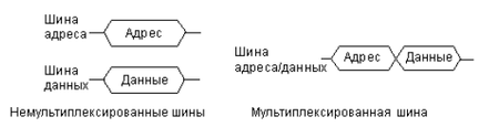 Для снижения общего количества линий связи магистрали часто применяется мультиплексирование шин адреса и данных. То есть одни и те же линии связи используются в разные моменты времени для передачи как адреса, так и данных (в начале цикла — адрес, в конце цикла — данные). Для фиксации этих моментов (стробирования) служат специальные сигналы на шине управления. Понятно, что мультиплексированная шина адреса/данных обеспечивает меньшую скорость обмена, требует более длительного цикла обмена (рис. 2.1). По типу шины адреса и шины данных все магистрали также делятся на мультиплексированные и немультиплексированные.