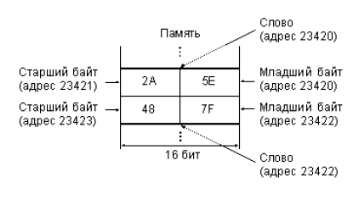При обращении к целому слову (с содержимым 2А5Е) процессор выставляет адрес 23420. При обращении к младшему байту этой ячейки (с содержимым 5Е) процессор выставляет тот же самый адрес 23420, но использует команду, адресующую байт, а не слово. При обращении к старшему байту этой же ячейки (с содержимым 2А) процессор выставляет адрес 23421 и использует команду, адресующую байт. Следующая по порядку 16-разрядная ячейка памяти с содержимым 487F будет иметь адрес 23422, то есть опять же четный. Ее байты будут иметь адреса 23422 и 23423.