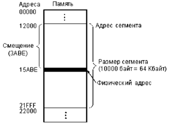 Рис. 3.5. Формирование физического адреса памяти из адреса сегмента и смещения.