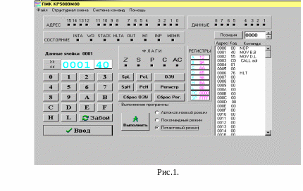 В верхней части окна (рис.1) указываются режимы работы: “файл”, “структурная схема”, “система команд”, “помощь”.