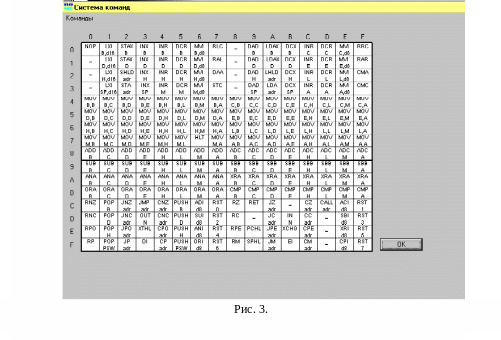 При указании “мышью” в окне “ПМК КР580ВМ80” на позицию. “Система команд”, раскрывается окно “Команды” в