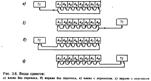 содержимое каждого разряда аккумулятора передается в соседний старший разряд (A m+1 (Am))» содержимое старшего разряда передается в младший разряд (А0А7)) и одновременно в триггер переноса (Тc (А7)).