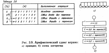 Затем дважды выполняется операция циклического сдвига вправо с переносом (блоки 3 и 4). В результате выполнения первой операции сдвига в аккумуляторе восстанавливается исходное число, а в триггере Тс оказывается продублированным знак числа. После выполнения второй операции сдвига в аккумуляторе оказывается число, являющееся результатом выполнения арифметического сдвига вправо.
