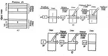 Обмен со стеком производится двухбайтовыми словами, занимающими две ячейки памяти. Пусть указатель стека хранит адрес А. При вводе нового слова его байты должны быть помещены в пару соседних со входом в стек ячеек, имеющих адреса А-1 и А-2. Таким образом, ввод в стек сводится к следующей последовательности действий: содержимое SP уменьшается на единицу и по образующемуся в SP адресу помещается старший байт вводимого двухбайтового слова: затем содержимое SP вновь уменьшается на единицу и по образующемуся в нем адресу помещается младший байт вводимого слова (рис. 3.7,б).