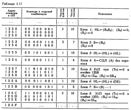 На рис. 3. 11 представлена схема алгоритма. Блок 1 производит установку нулевого значения в паре регистров HL. Блок 2 устанавливает в регистре В (счетчике) начальное значение 8. Блок 3 производит сдвиг на один разряд влево содержимого пары регистров HL; эта операция выполняется путем удвоения содержимого этой пары регистров: HL (HL) + (HL). Блок 4 предназначен для анализа очередного разряда множителя; для этого содержимое аккумулятора А сдвигается влево, в результате чего очередной разряд хранимого в нем множителя передается в триггер Тс регистра признаков. Блок 5 производит разветвление по содержимому триггера Тс. При (Тс) = 1 в блоке 6 выполняется операция прибавления множимого (содержимого пары регистров DE) к сумме предыдущих, частичных произведений в паре регистров HL. При (Тс) = 0 операция суммирования не выполняется, по команде условного перехода осуществляется переход к команде блока 7. Блок 7 производит вычитание единицы из содержимого счетчика (регистра В), после чего блок 8 выполняет разветвление по содержимому триггера Tz регистра признаков. Если при выполнении команды блока 7 в регистре В образуется нулевое значение, в триггере Tz устанавливается значение лог. 1, происходит выход из циклами переход к очередной, команде. Если содержимое регистра В не равно нулю, то в триггере Тz устанавливается значение 0 и команда условного перехода производит переход к команде блока 3, вызывая очередное повторение цикла.