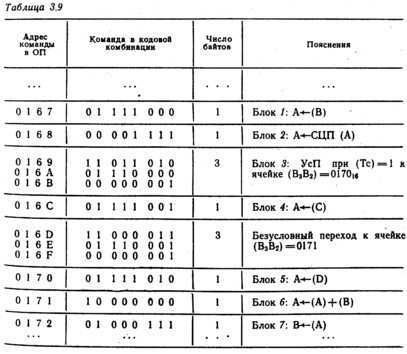 В табл. 3.10 показано размещение команд в ячейках ОП.
