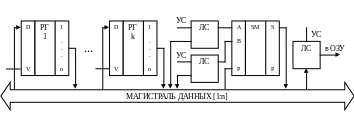 Одной из отличительных особенностей этой структуры является наличие единой двунаправленной магистрали данных, по которой данные поступают из памяти и любого регистра, а также выдаются в память и регистры. В состав АЛУ входят несколько регистров РГ(1:к) общего назначения (РОН), а также сумматор (SM) и дешифратор (DC). Кроме того, может быть единый блок, реализующий операции сдвигов ( на схеме не показан). Функционирование АЛУ определяется микроинструкциями, которые поступают из УУ на дешифратор (DС). На выходе DC появляются УС, поступающие на регистры и ЛС на входах и выходе сумматора в соответствии с выполняемым алгоритмом.